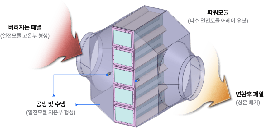 폐열원(뜨거운 면)과 냉각원(차가운 면)의 온도 차이를 이용하여 전기를 직접 생산하는 핵심 장치